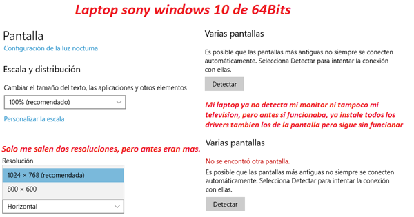 Y antes me aparecían más resoluciones de pantalla y hoy solo 2, ¿por qué sera eso? ¿Qué tengo que hacer? O sera que mi laptop ya esta obsoleta.