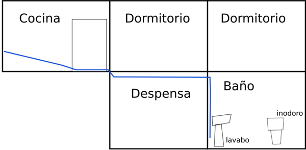 El siguiente diagrama deja ver la estructura actual de la casa. Mi idea es pasar el desagüe por la despensa y llevarlo hasta el baño. La división entre despensa y baño es un tabique de ladrillo.