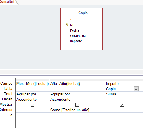 Joer, que dais pocas explicaciones!. Puedes hacerlo de muchas formas, todo depende de como lo quieras. Por ejemplo, supongamos que tienes una tabla Ventas con,,,, Fechaventa(dd/mm/aaaa)... Importe. Puedes hacer una consulta y poner el campo