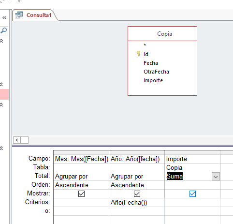 Y le añades el campo Importe y en la barras de menús pulsas donde pone totales y agrupas Mes en Agrupar por ye Importe lo agrupas por suma y con eso ya puedes hacer el gráfico. Lógicamente tal como lo he puesto ahora mismo sólo te serviría para este año y los anteriores. Por eso podrías añadirle un campo