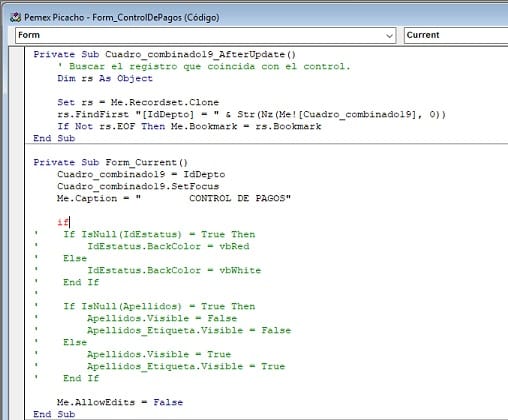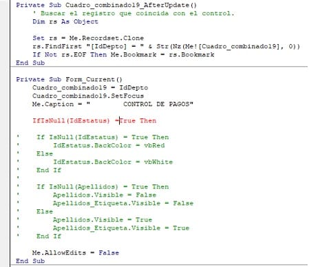 Al hacer Código no se muestra opciones de Access, y ademas las instrucciones se ponen en rojo.