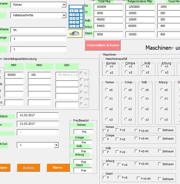 ¡Gracias! A continuación te envío una parte de los botones y los checkbox, como vez botones y comboxe con el mismo nombre pertenece a la misma maquina : que significa arriba una maquina o dos rota, abajo las maquinas que están trabajando, los primero tres checkboxes me dan los tres turnos de trabajo y el cuarto me da en trabajo en un plazo de tiempo determinado. Observa el código que te envíe y veras la calculacion de los diferentes situaciones. Esto funciona, lo que me hace falta es que cuando con el combox 1 elija la maquina por ejemplo Komax me salgan los botones y checkboxes que previamente yo he marcado para realizar esa calcculacion Pues a veces para volver a realizar otra calculacion no se sabe cual fue el turno o la maquina elegida . Muchas Gracias por tu rápida y por el tiempo que tomas en responderme. Esto es un formulario en excel.