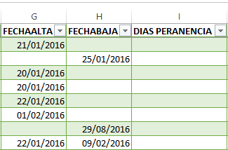 Quisiera calcular los días transcurridos entre una fecha de alta y una de baja. Como se ve el la imagen en el excel hay una columna con la fecha de alta, otra con la fecha de baja y otra que es dias de permanencia.