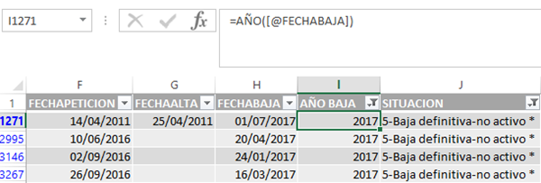 Pero tuve que añadir un campo adicional a la tabla para extraer el año de la fecha baja y aquí es donde necesito la ayuda como puedo hacerlo directamente en la formula sin tener que añadir ese campo?