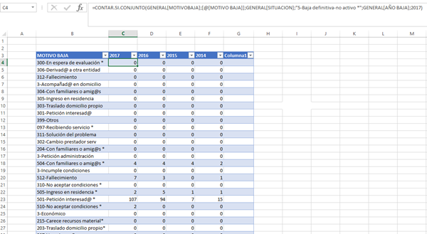 =CONTAR.SI.CONJUNTO(GENERAL[MOTIVOBAJA];[@[MOTIVO BAJA]];GENERAL[SITUACION];"5-Baja definitiva-no activo *";GENERAL[AÑO BAJA];2017)