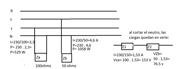 Revisando un ejercicio de electrotecnia de 2º año, el profesor nos hablo de lo que pasaría al cortar el cable neutro de la línea III... ILUSTRANDO así: