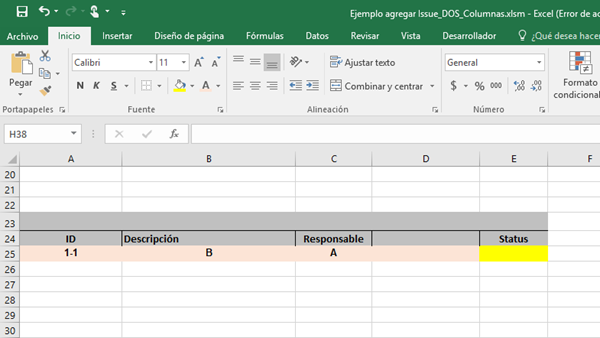 Yo inserto la fila 25 con un código sencillo que hice pero quiero que en la celda 25E (la de color amarillo) me aparezca una lista desplegable donde yo pueda seleccionar una de las 2 opciones en el Status: "Open " o "Closed"