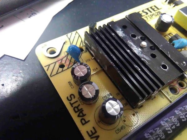 Si no es un diodo podría ser un condensador en corto, veo 3 condensadores al lado del conector negro que podrían estar hinchados, y dos mas en la esquina de abajo a la izquierda que también parecen hinchados pero la foto no es muy buena y no se aprecia bien.