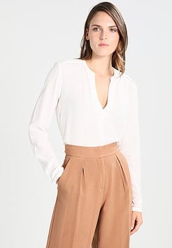 I. Hola, en mi opinión un color salmón/rosa tenue combinaría muy bien. Otras opciones pueden ser celeste, azul, blanco o el repetir el mismo color en blusa y pantalón, puedes ver algunos ejemplos, incluyendo incluso ornamentos florales sobre azul marino o el color negro.