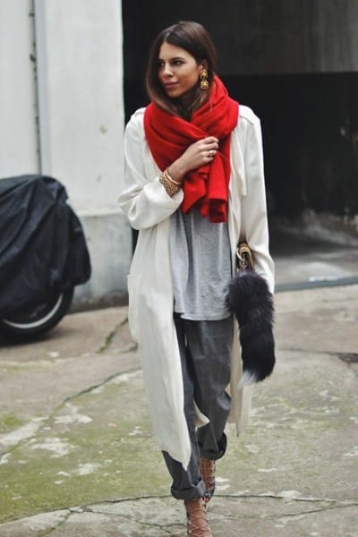 Sobre la bufanda en verdad no sé opinar, creo que dependerá de la tonalidad/tipo de rojo, pero en general no me parece que combinen de forma adecuada, siendo preferible un color gris claro o marrón también claro.