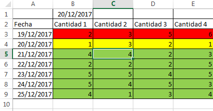 Para el ejemplo anterior, quisiera que el código validara la fecha que se encuentra en A3<$B$1, el rango de B3:E3 sea ROJO, pero que si A3=$B$1, el rango de B3:E3 sea AMARILLO, Y por ultimo A3>$B$1, el rango de B3:E3 sea Verde, y así sucesivamente hasta la ultima fecha.