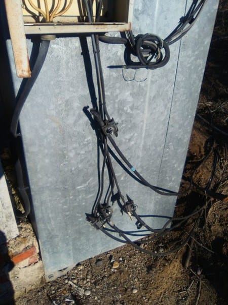 La instalación en la casa es nefasta. La tres fases, van rodeando esta gran casa de una forma aérea y agarradas a la pared. En la estancia donde se necesitaba consumo, engancharon un vampiro (niled) a una fase, y otro al neutro, que va a un ID sin su magnetotérmico correspondiente y así, por unos 150 mts, rodeando la casa.