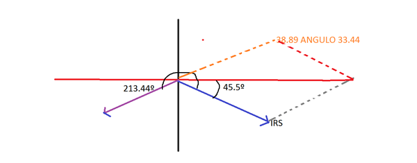 Mientras que ITR vale 38.89 y esta a 213º y esta representado con un fasor violeta