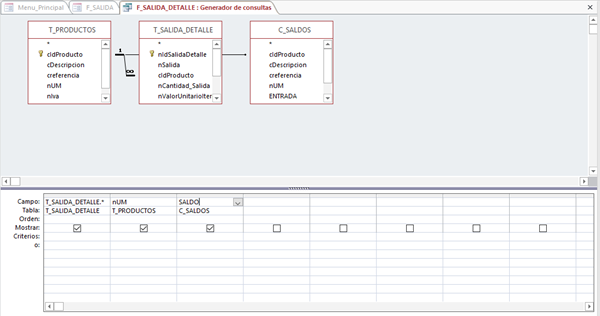 Tengo un subformulario con vista "Hoja de datos" en el cual diligecio productos para darles salidas de almacén, también tengo dos tablas, una llamada "Entradas" y la otra llamada "Salidas" las cuales traigo en una consulta para sacar el saldo de almacén con un campo calculado en la misma.