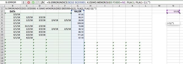 Tengo una tabla con varias fechas (entre las columnas B3 y F5000 que pueden repetirse varias veces) y me gustaría saber la fórmula para devolver el valor de la columna G:G en una nueva columna (la N por ejemplo) solo los importes correspondientes de la columna G. He buscado con fórmulas e incluso con fórmulas de matrices y no he logrado. A ver si alguien puede ver una solución en la imagen adjunta.