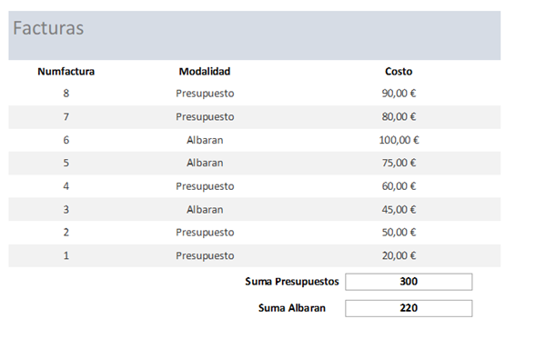 Estoy trabajando una DB en Access 2010 en la cual tengo una tabla llamada proyecto y otra llamada movimientos, en la primera tengo toda la información básica de un proyecto incluyendo los campos valor aprobado (formato moneda) por cada una de las modalidades (Convocatoria, apoyo, etc), ose que para cada modalidad se pueden aprobar recursos; en la tabla movimiento llevo a cabo todos los movimiento financieros de los proyectos, relacionados mediante subformulario. En esta ultima tabla tengo un campo valor movimiento en formato moneda. Ahora quiero generar un informe donde el criterio sera el código del proyecto; y que me sume lo que ha ido gastando el proyecto dependiendo la modalidad para luego en otro campo calcular lo aprobado VS por gastado y poder tener un saldo. Adjunto imagen del informe que quiero generar.