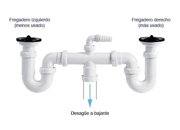 Tengo en la cocina un fregadero de doble seno, con desagües independientes y salida a la bajante conjunta. Cada uno de los sumideros tiene su sifón propio, pero ambos desagües se comportan de una manera totalmente desigual, sin respetar la ley de vasos comunicantes. Mientras la pila izquierda desagua perfectamente, es decir, que cuando se tira una gran cantidad de agua se va perfectamente por el sumidero, la pila derecha se llena todo el tubo hasta arriba, de modo que incluso si se vierte una gran cantidad, desborda por el sumidero izquierdo.
