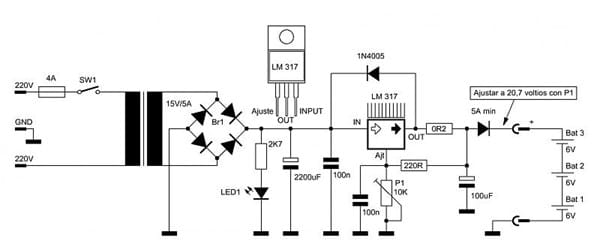 Para el regulador, podrás usar un circuito como el que te dejo... pero regulando a unos 14 voltios para cargar la batería: El de la figura dice 20 voltios, porque pretende cargar una serie de 3 baterías de 6 voltios. Y el transformador que figura en el circuito, sera el que hablamos más arriba.