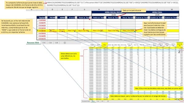 La hoja Resumen-MAX es la hoja principal, los datos están distribuidos en el resto de las hojas. Todo se basa en encontrar en las demás hojas el dato KW as KwTot (Columna I). Para encontrarlo, en la columna equipo las tres primeras letras define en que hoja se buscará, el resto es el valor a buscar, pero en este caso, todas las veces que aparezca se analizará solo dentro del horario definidos en la celda $G$2 a K2$J$2), tomemos de ejemplo el equipo CUS4040 de la fila 8, bien, en este caso irá a la hoja CUS, busará en la columna "kw as kw tot" el mayor pero solo aquellos que cumplan con el horario de 10 a 16 horas como está definido en la parte superior HORA INICIAL y HORA FINAL, sin tomar en cuenta la fecha (solo horario), la fórmula que te comparto lo hace y regresa el valor 2300, ¿pero ahora como decirle que me traiga los otros datos que requiero una ves localizado ese valor máximo?