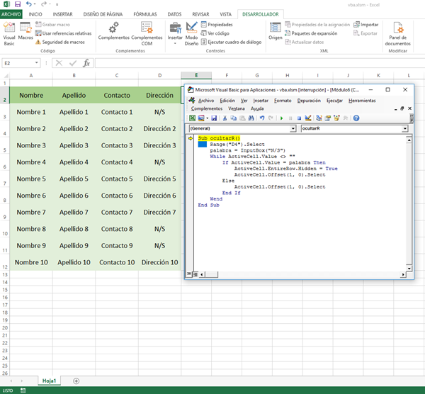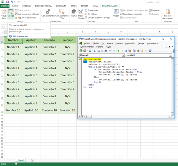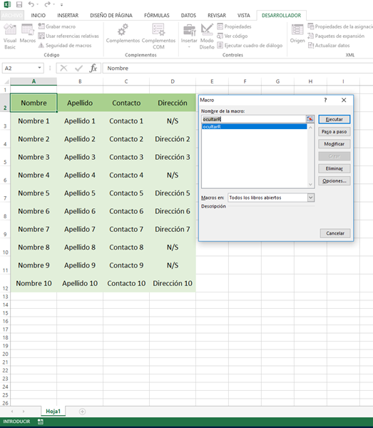 Donde la Macro que quiero implementar tiene por objetivo quitar, en realidad ocultar (sin borrarlas) a las Filas que tengan en la Columna "Dirección" el valor de "N/S"..