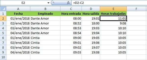 Por último cambia el formato de la columna H al mismo formato de hora que utilizamos en la columna E.