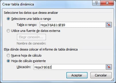 Ahora crea una tabla dinámica. Selecciona los datos, ve al Menú Insertar, Tabla dinámica, Tabla dinámica. Selecciona el campo "Hoja de cálculo existente", y después selecciona alguna celda de tu hoja. Presiona Aceptar.