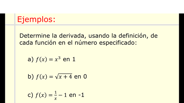 $$\begin{align}&\text{Definición de derivada en }x_0\\&f'(x_0)=\lim_{h \to 0} \frac{f(x_0+h)-f(x_0)}{h}\\&---\\&a) f(x) = x^3........x_0=1\\&f'(1)=\lim_{h \to 0} \frac{f(1+h)-f(1)}{h} = \lim_{h \to 0} \frac{(1+h)^3-1^3}{h}=\\&\lim_{h \to 0} \frac{1^3+3\cdot 1^2 \cdot h+3\cdot 1\cdot h^2+h^3-1^3}{h}=\lim_{h \to 0} \frac{3h+3h^2+h^3}{h}=\\&\lim_{h \to 0} \frac{h(3+3h+h^2)}{h}=\lim_{h \to 0} (3+3h+h^2)=3\\&...\\&b) f(x) = \sqrt{x+4}....x_0=0\\&f'(0)=\lim_{h \to 0} \frac{f(0+h)-f(0)}{h} = \lim_{h \to 0} \frac{\sqrt{(0+h+4)}-\sqrt{0+4}}{h}=\\&\lim_{h \to 0} \frac{\sqrt{(h+4)}-\sqrt{4}}{h}=\lim_{h \to 0} \frac{\sqrt{(h+4)}-\sqrt{4}}{h}\cdot \frac{\sqrt{(h+4)}+\sqrt{4}}{\sqrt{(h+4)}+\sqrt{4}}=\\&\lim_{h \to 0} \frac{(h+4)-4}{h(\sqrt{(h+4)}+\sqrt{4})}=\lim_{h \to 0} \frac{h}{h(\sqrt{(h+4)}+\sqrt{4})}=\\&\lim_{h \to 0} \frac{1}{\sqrt{(h+4)}+\sqrt{4}}=\frac{1}{4}\end{align}$$Espera que otro experto te resuelva el tercero o envíalo en una nueva pregunta.
