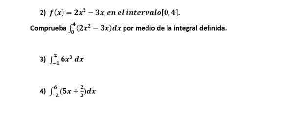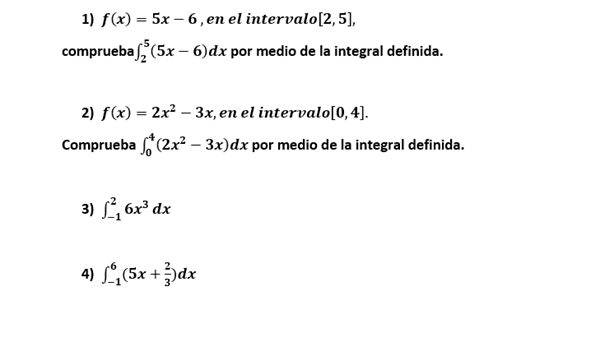 Resuelve Cada uno de los siguientes ejercicios por medio de la suma de Riemann (todos por suma de Riemann y los 2 primeros se comprueban también por integral definida (a y b)), identificando primero cada una de las partes del punto 2 (análisis) y siguiendo un procedimiento para obtener el área de las funciones dadas: