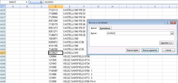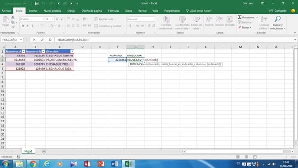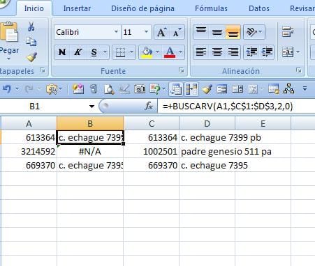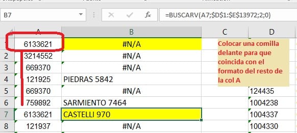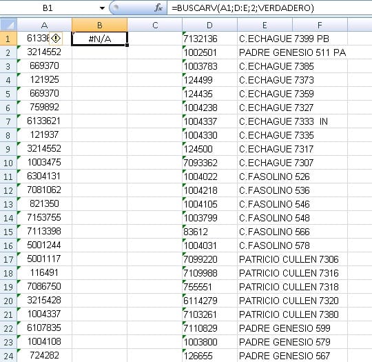 En la columna A tengo algunos números que corresponden a una dirección, en la columna D están todos los números y en la E la dirección a la que corresponde cada numero. Y quiero que en la columna B me salga la dirección a la que corresponde ese numero, entonces utilizo BUSCARV, pero me sale con error