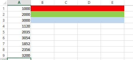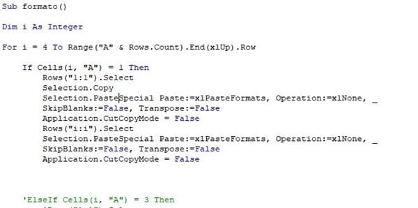 Querría crear una macro en la que me copiase el formato de la fila 1 para aquellas filas cuyo valor de A está entre 1000 y 1999, el de la fila 2 para las filas entre 2000 y 2999 y el de la fila 3, entre 3000 y 3999.