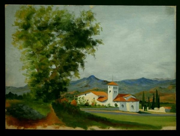 3º.- OLEO sobre lienzo pegado a cartón. Detrás firmado por el autor (sin identificar: Joan y algo más). También indica el autor: Olot 1943. Mide 33 x 24 cm.