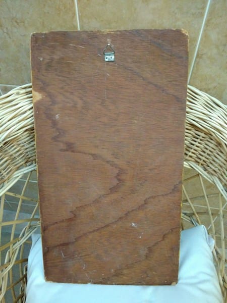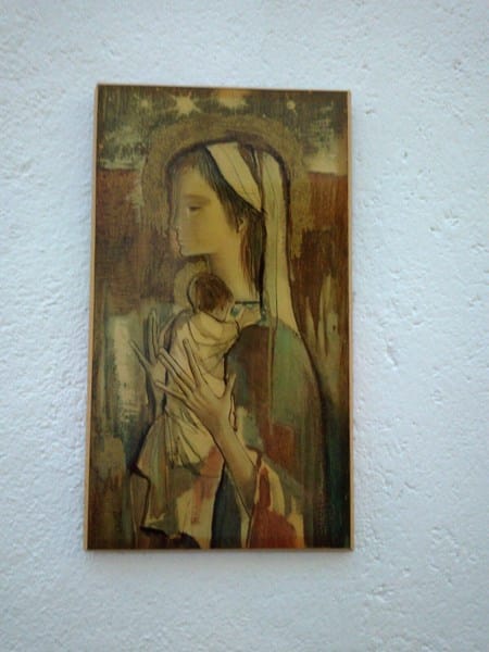 Se trata de una pintura sobre tabla con unas medidas de 44 x 24 cms, donde se ven representados a la Virgen con el niño. La firma de la autora aparece en el margen inferior izquierdo y debe haberse realizado en los años 40 o a lo sumo a principios de los 50.