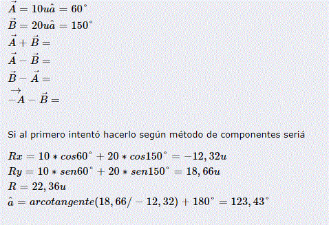 Hola amigos podrían ayudarme con el siguiente ejercicio. Yo se hacerlo usando el teorema del coseno para sacar la resultante y luego el teorema de seno para calcular la dirección. Pero se puede hacer usando propiedades. Muchas gracias