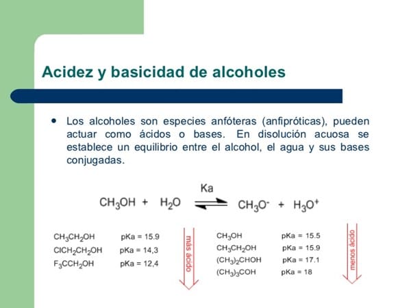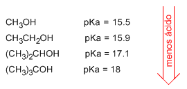 Aquí se ve que el metanol es el más ácido de todos, y a medida que pones CH3 a la molécula la vas volviendo menos ácida.