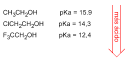 Fíjate que al etanol sustituyes H (Hidrógeno) por Cl (Cloro) o F (Flúor) la molécula se vuelve más ácida.