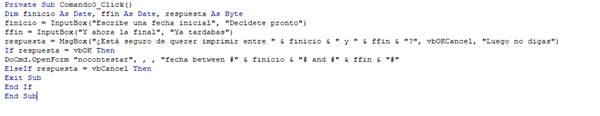 tengo un bbdd en la cual tengo tablas, consultas, formularios e informes, tengo las consultas que lanzan el criterio Entre [Introduzca fecha inicial Informe] Y [Introduzca fecha final Informe], y me gustaría visualizar ese criterio y que luego me pregunte si deseo imprimirlo, ¿seria posible?