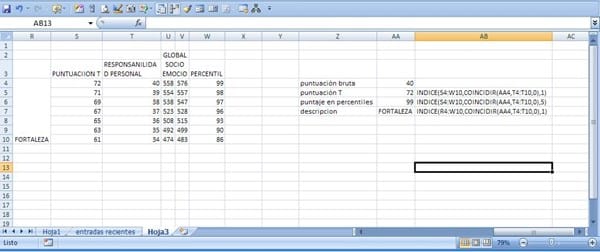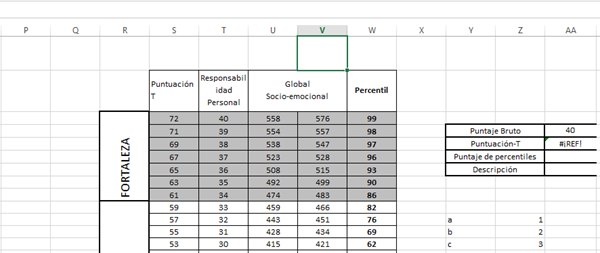 Tengo esta lista de puntuaciones. Me gustaría que la puntuación que aparece en AA4 (40) en la tabla de Puntaje Bruto, la de la derecha) pueda automáticamente arrojar en la Puntuación-t(AA5) el puntaje correspondiente de acuerdo a la tabla S3 A S43. La referencia de las puntuaciones brutas están en T3 A T43. Así luego podría con la misma fórmula conseguir el percentil. Además si es la misma fórmula para colocar el valor de R que es letra como Fortaleza en AA7. Mil gracias