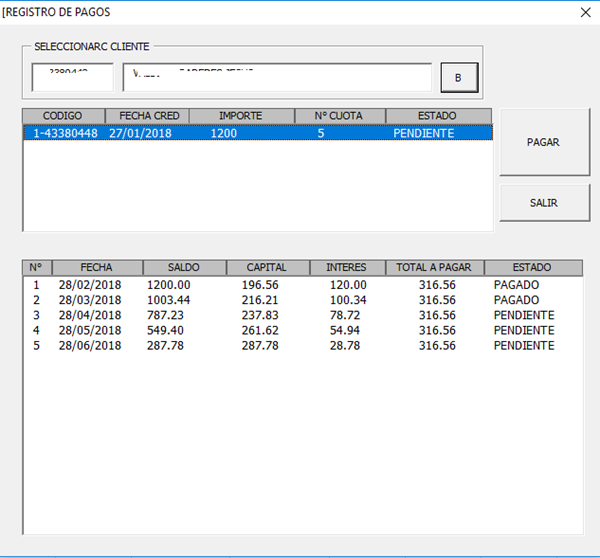 Tengo el siguiente cliente con sus respectivas cuotas, hice la macro para realizar el pago por cada una de sus cuotas hasta ahí todo bien.