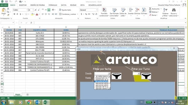 Dim h1 ' Private Sub CommandButton1_Click() 'filtra por fechas If ActiveSheet.AutoFilterMode Then ActiveSheet.AutoFilterMode = False ListBox1.Clear If ComboBox1.Value = "" Then MsgBox "Seleccione una Fecha 'DESDE'" Exit Sub End If fec1 = CDate(ComboBox1.Value) If ComboBox2 = "" Then fec2 = fec1 Else fec2 = CDate(ComboBox2.Value) End If ' u = h1.Range("E" & Rows.Count).End(xlUp).Row For i = 3 To u lafecha = h1.Cells(i, "E").Value If h1.Cells(i, "E").Value >= fec1 And h1.Cells(i, "E") <= fec2 Then ListBox1. AddItem h1.Cells(i, "A") ListBox1. List(ListBox1.ListCount - 1, 1) = h1.Cells(i, "B") ListBox1. List(ListBox1.ListCount - 1, 2) = h1.Cells(i, "C") ListBox1. List(ListBox1.ListCount - 1, 3) = h1.Cells(i, "D") ListBox1. List(ListBox1.ListCount - 1, 4) = h1.Cells(i, "E") ListBox1. List(ListBox1.ListCount - 1, 5) = Format(h1.Cells(i, "F"), "hh:mm") ListBox1. List(ListBox1.ListCount - 1, 6) = Format(h1.Cells(i, "G"), "hh:mm") ListBox1. List(ListBox1.ListCount - 1, 7) = h1.Cells(i, "H") End If Next End Sub ' Private Sub CommandButton5_Click() ' Por Dante Amor ' 'Filtra por turno If h1.AutoFilterMode Then h1.AutoFilterMode = False ListBox1.Clear If ComboBox3.Value = "" Then MsgBox "Seleccione un Turno" Exit Sub End If If ComboBox1.Value = "" Then fec1 = "" Else fec1 = CDate(ComboBox1.Value) End If If ComboBox2 = "" Then fec2 = fec1 Else fec2 = CDate(ComboBox2.Value) End If ' u = h1.Range("E" & Rows.Count).End(xlUp).Row lamisma = False For i = 3 To u lafecha = h1.Cells(i, "E").Value If fec1 = "" Then fec1 = h1.Cells(i, "E"): lamisma = True If fec2 = "" Then fec2 = h1.Cells(i, "E") If h1.Cells(i, "E").Value >= fec1 And h1.Cells(i, "E") <= fec2 And _ h1.Cells(i, "A") = ComboBox3.Value Then ListBox1. AddItem h1.Cells(i, "A") ListBox1. List(ListBox1.ListCount - 1, 1) = h1.Cells(i, "B") ListBox1. List(ListBox1.ListCount - 1, 2) = h1.Cells(i, "C") ListBox1. List(ListBox1.ListCount - 1, 3) = h1.Cells(i, "D") ListBox1. List(ListBox1.ListCount - 1, 4) = h1.Cells(i, "E") ListBox1. List(ListBox1.ListCount - 1, 5) = Format(h1.Cells(i, "F"), "hh:mm") ListBox1. List(ListBox1.ListCount - 1, 6) = Format(h1.Cells(i, "G"), "hh:mm") ListBox1. List(ListBox1.ListCount - 1, 7) = h1.Cells(i, "H") End If If lamisma Then fec1 = "" fec2 = "" End If Next End Sub ' Private Sub CommandButton2_Click() 'Exporta 'MsgBox "RECUERDE: Solo un PDF a la vez" If h1.AutoFilterMode Then ActiveSheet.AutoFilterMode = False u = h1.Range("F" & Rows.Count).End(xlUp).Row f1 = Format(ComboBox1.Value, "mm/dd/yyyy") If ComboBox2.Value = "" Then f2 = f1 Else f2 = Format(ComboBox2.Value, "mm/dd/yyyy") End If ' ruta = ThisWorkbook.Path & "\" arch = "BitacoraMantencion" prefijo = "" ver = "" ext = ".pdf" una = True Do While True If Dir(ruta & arch & prefijo & ver & ext) <> "" Then prefijo = "_v" If una Then ver = 1 una = False Else ver = ver + 1 End If Else Exit Do End If Loop ' If ComboBox1 <> "" Then h1.Range("$A$2:$H$" & u).AutoFilter Field:=5, Criteria1:= _ ">=" & f1, Operator:=xlAnd, Criteria2:="<=" & f2 End If If ComboBox3 <> "" Then h1.Range("$A$2:$H$" & u).AutoFilter Field:=1, Criteria1:= _ "=" & ComboBox3 End If h1.ExportAsFixedFormat Type:=xlTypePDF, _ Filename:=ruta & arch & prefijo & ver & ext, _ Quality:=xlQualityStandard, IncludeDocProperties:=True, _ IgnorePrintAreas:=False, OpenAfterPublish:=True If h1.AutoFilterMode Then ActiveSheet.AutoFilterMode = False End Sub Private Sub CommandButton4_Click() 'exportar a hoja Application.ScreenUpdating = False Application.DisplayAlerts = False ' Set l1 = ThisWorkbook 'Set h1 = ActiveSheet ruta = ThisWorkbook.Path & "\" arch = ActiveSheet.Name If h1.AutoFilterMode Then h1.AutoFilterMode = False u = h1.Range("A" & Rows.Count).End(xlUp).Row h1.Copy Set l2 = ActiveWorkbook Set h2 = l2.Sheets(1) f1 = CDate(ComboBox1.Value) If ComboBox2.Value = "" Then f2 = f1 Else f2 = CDate(ComboBox2.Value) End If ' For i = u To 3 Step -1 If h2.Cells(i, "E") >= f1 And h2.Cells(i, "E") <= f2 Then Else h2.Rows(i).Delete End If Next On Error Resume Next h2.DrawingObjects("Button 1").Delete On Error GoTo 0 l2.SaveAs Filename:=ruta & arch & ".xlsx", _ FileFormat:=xlOpenXMLWorkbook, CreateBackup:=False l2.Close MsgBox "Base de datos guardada en ESCRITORIO" End Sub ' Private Sub UserForm_Activate() Set h1 = Sheets("Ingresar") For i = 3 To h1.Range("E" & Rows.Count).End(xlUp).Row Call Agregar(ComboBox1, h1.Cells(i, "E").Value) Call Agregar(ComboBox2, h1.Cells(i, "E").Value) Call Agregar(ComboBox3, h1.Cells(i, "A").Value) Next End Sub ' Sub Agregar(combo As ComboBox, dato As String) For i = 0 To combo.ListCount - 1 Select Case StrComp(combo.List(i), dato, vbTextCompare) Case 0: Exit Sub 'ya existe en el combo y ya no lo agrega Case 1: combo.AddItem dato, i: Exit Sub 'Es menor, lo agrega antes del comparado End Select Next combo.AddItem dato 'Es mayor lo agrega al final End Sub ' Private Sub TXTATRAS_Click() Unload Me End Sub