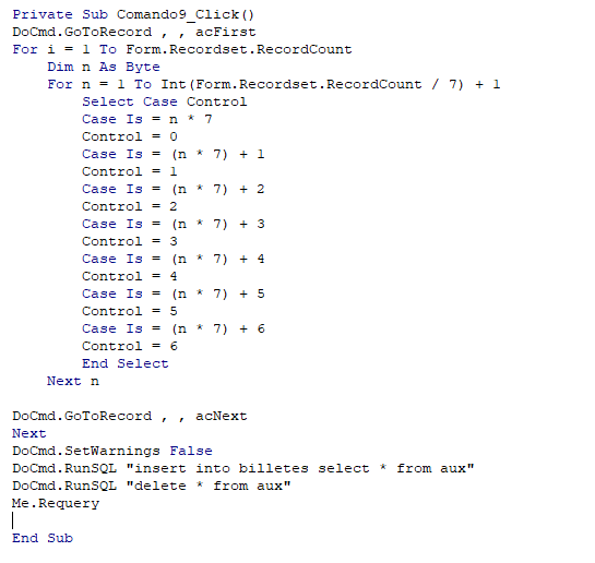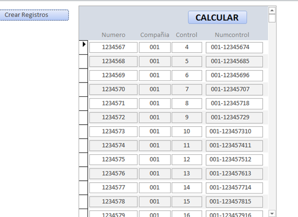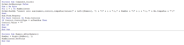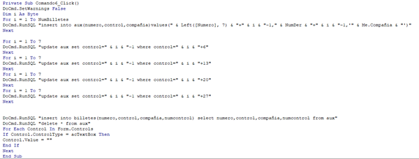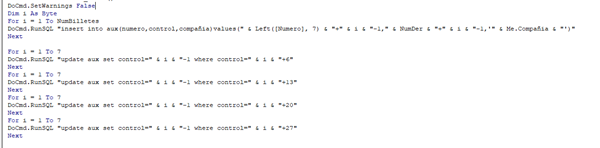 DoCmd.RunSQL "Insert into aux(numero,control,compañia,numcontrol)Values(" & Left([Numero], 7) & "+" & i & "-1," & Numder & "+" & i & "-1,'" & Me.Compañia & "')"