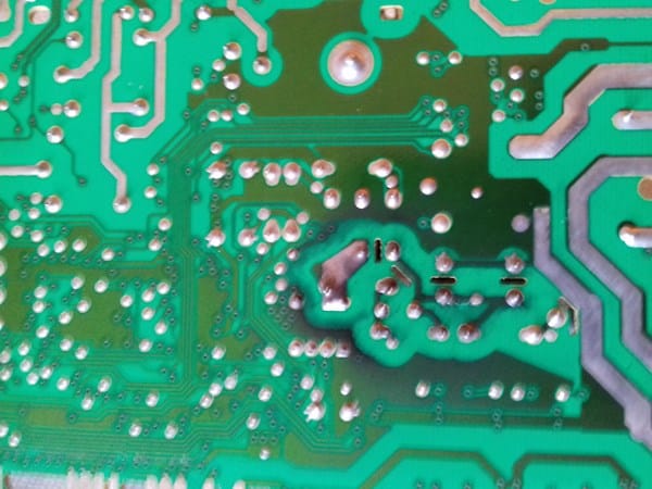 La pata de más a la derecha se puede ver dentro del triac, parte del triac se ha desintegrado y ha dejado un crater en la parte derecha del mismo. Hay que sustituirlo y tener suerte que no haya quemado nada más.