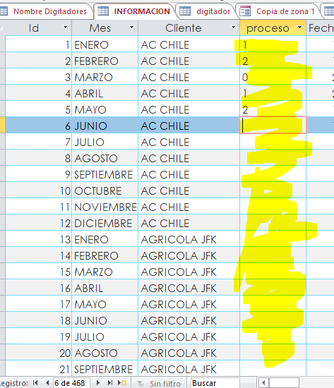 El caso que estoy trabajando en access y en un formulario llamado "zona 1" y cuyo origen es la tabla "INFORMACION", ya en dicho formulari como se adjuntó en la imagen hay botones que la idea es que al momento de clickear cada uno estos cambien de color pero en el registro indicado previamente, cuyo registro esta vinculado a un cliente y cada cliente a todos los meses, el problema es asignarle el valor que quede justo en ese registro tal vez usando el "Id" nomás, el campo donde debe guardarse es el "proceso", la idea que me tiene más complicada más que se agregue el color, es que lo haga en el registro que uno le quiere dar pero eso no sé como se hace, al momento que ya se clicke el botón para cambiar el color ya este identificado en ese registro con Id por ejemplo 8