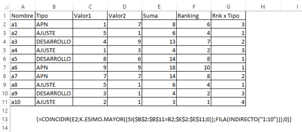 (O ver si existe alguna formula)que me seleccione los datos de cada tipo y me haga un ranking, para luego devolverlo a la base( El ranking debe ser de acuerdo a cada tipo y no con un general).(Por ejemplo en la imagen la jerarquización se hace en base a todos los parámetros, y debe ser un ranking en base a cada tipo en la misma base)
