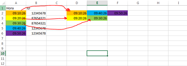 Si ingreso el ID:"12345678" en la celda B7 debería de copiar la hora de la celda A7 en la celda G2.