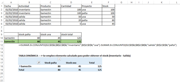 2. Utilizando tablas dinámicas para organizar los datos y empleando "Elementos calculados" para obtener el stock final.