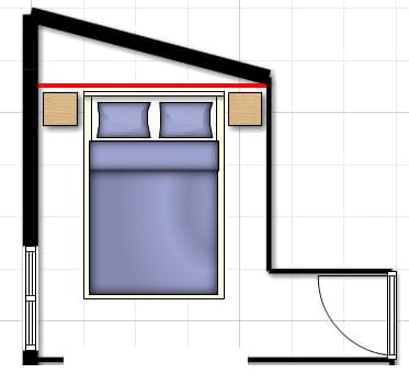 Estoy ayudando a mis padres con unas obras en casa y ahora toca el turno de la habitación de matrimonio. Queremos situar la cama en una pared que está levantada de forma diagonal con lo cual estéticamente la cama no queda bien (adjunto plano).