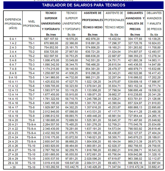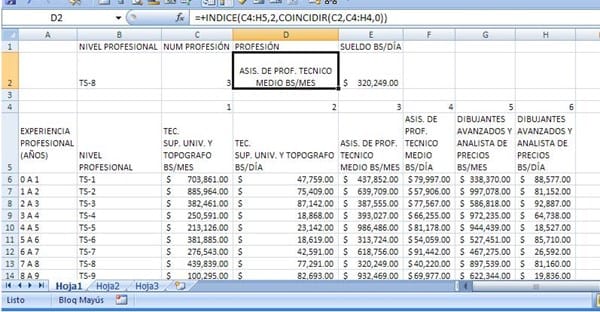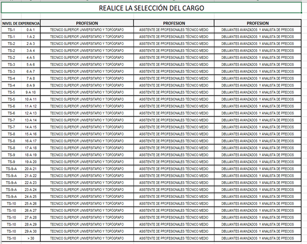 Estoy trabajando con un tabulador que tiene tres categorías de profesionales; Técnico Superior, Asistentes y Dibujantes y cada una de estas categorías les varia el salario de acuerdo a los años de experiencia que tengan, como verán en el capture.