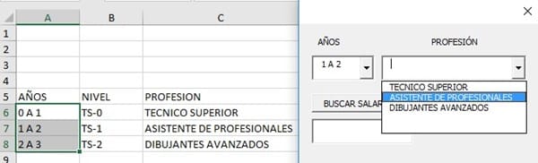 Hasta allí todo va bien, el problema se me presenta cuando quiero seleccionar otra categoría por ejemplo dibujantes, no encuentro la manera de que me haga la selección de las profesiones, debe darme la opción de seleccionar la que yo necesite; Técnicos, Asistente o Dibujantes y me debe traer el salario diario dependiendo de la selección por ejemplo TS-8 de 16 a 17 debería arrojarme 64.302,25 ahora, el Dibujante con el mismo periodo de experiencia debería arrojarme 22.695,60 y el Asistente debería dar 45.253,87