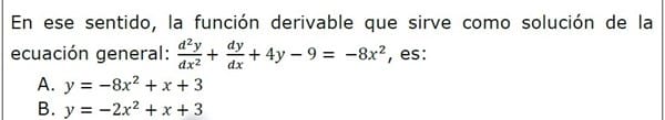 Esta es una ED de segundo orden (la derivada de mayor grado es y ' ' ). De las soluciones propuestas sólo B corresponde a una solución particular. Resolveré por coeficientes indeterminados.