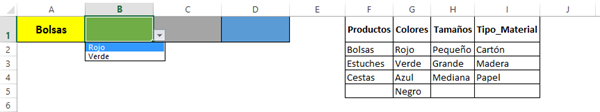 Quisiera que cuando pongo en la primera columna "Bolsa" en la segunda lista sólo me salga rojo y verde, y en la tercera grande y mediana y en la cuarta carton